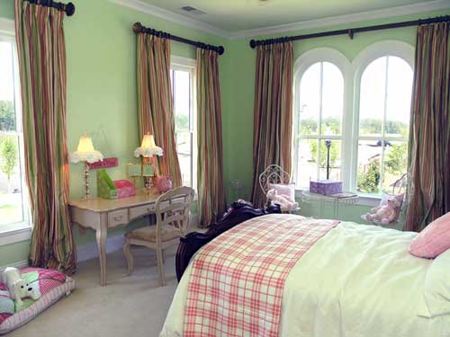 При выборе штор следует ориентироваться на общую колористику комнаты. Если обои, текстиль и игрушки здесь яркие, то окна лучше «одеть» в однотонные нейтральные занавески. В том случае, если в интерьере мало пестрых деталей, текстиль для окон лучше подобрать яркий, с большими рисунками. Но самое главное – шторы должны быть изготовлены из экологически чистых и легких в уборке материалов, не вызывающих аллергию. Любой хозяйке известно, что шторы – это место сбора пыли, которая в детской строго противопоказана.