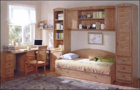 Тенденцией нашего времени можно считать также совмещение функции спальни и рабочего места, где выделяется место для персонального компьютера и приставных элементов. Для таких моделей характерны приятные мелочи вроде навесных подушек на липучках или на завязках, а также мебель на роликах, что делает ее более мобильной.