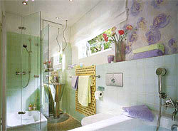 Угловая душевая кабина позволяет добиться комфорта на минимальной площади. Для тесных помещений такой вариант оптимален: центр вращения двери можно устанавливать индивидуально, можно также приобрести кабины с угловым входом, с раздвижными дверями, а также круглой и пятигранной формой. Благодаря корпусу из натурального стекла она совершенно не загромождает пространство. В совсем крохотных ванных можно ограничиться только душем и отказаться от встроенного поддона, благодаря чему комната будет казаться просторнее. Такой душ может отделять от остального пространства ванны только легкая стеклянная перегородка, которая защищает помещение от брызг.