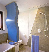 Перегородка может разделять также ванну и раковину, раковину и душевую кабинку, которая таким образом надежно изолируется. Главное же достоинство такой перегородки в том, что она скрывает в себе систему трубопроводов.