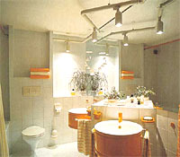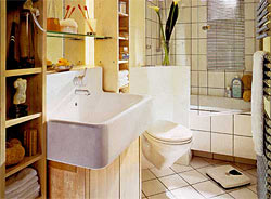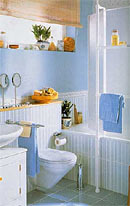 Мебель и оборудование. В ванной комнате важно оптимально использовать возможности для хранения вещей, не жертвуя при этом свободным пространством. Специально для небольших ванных комнат разрабатываются компактные ванны, душевые установки, зеркала, шкафы, малогабаритная мебель. Компактная светлая мебель из одной и той же коллекции придает помещению легкость. Практичной и удобным может оказаться стеллаж на роликовых опорах из хромированного металла с выдвижными контейнерами из проволочной сетки. Пространство под столешницей умывальника и над ним максимально используем для размещения полок и шкафов.