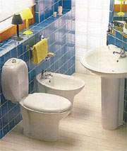 Цвет в ванной задают в основном настенная и напольная плитка. Здесь действует общее для всех типов помещений правило: светлые тона и прозрачные материалы зрительно расширяют пространство, темные уменьшают. Откажитесь от темных или слишком ярких тонов плитки, от плитки с крупным рисунком. Сверкающие поверхности тоже не подойдут - они утяжеляют впечатление. Поверхности и плитки и мебели лучше выбирать матовые. Уложенная по диагонали напольная плитка зрительно увеличивает помещение.