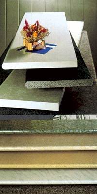 Первой ласточкой был кориан (детище фирмы DuPont), чуть позже появились гибралтар и SSV (фирма Wilsonart). Мне так и не удалось понять разницу в их химическом составе, поскольку это – запатентованное ноу-хау фирм. Но по внешнему виду и свойствам их с трудом различают даже профессионалы. Последняя новинка в этой области – «напыляемый» камень. Замечателен тем, что, в отличие от своих «листовых» предшественников, дает возможность отделывать «под натуральный камень» поверхности любой формы с минимальным расходом материала. Материал транспортируют в цистернах, наносят на готовое изделие распылителем. «Напыляемый» камень прекрасно чувствует себя даже на металле и стекле, не говоря уже о гипсе, ДСП и МDF.