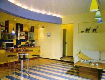 Подвесные потолки, арочные проемы, выступающие конструкции, колонны - все можно применить для зонирования. Хорошо использовать в двух разных зонах различные напольные покрытия. Сочетания кафеля на кухне и паркета или линолеума в столовой. Выбирайте индивидуальные цветовые композиции для каждой из зон. Интересно подчеркивает различие пространств и световое решение интерьера, на кухне можно использовать галогенные лампы и точечные светильники, столовую же отдайте дневному свету и общему освещению в вечерние часы. Индивидуально для каждого функционального пространства оформите окна.