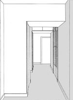 Еще один вариант перепланировки коридора. Если у Вас длинный и узкий коридор, тянущийся из одного конца квартиры до другого, то просто описанного выше приема "развалить" его цветом может оказаться недостаточно. Если коридор длинный и узкий - есть прямой смысл «разбить» его пространство с помощью перепада высоты потолка, получив при этом еще и две дополнительные антресоли. Если в середине коридора есть вход в какую-то из комнат, есть смысл устроить на противоположной этому входу стене напротив простенков два стенных шкафа, соединенных с нависающими над коридором антресолями.